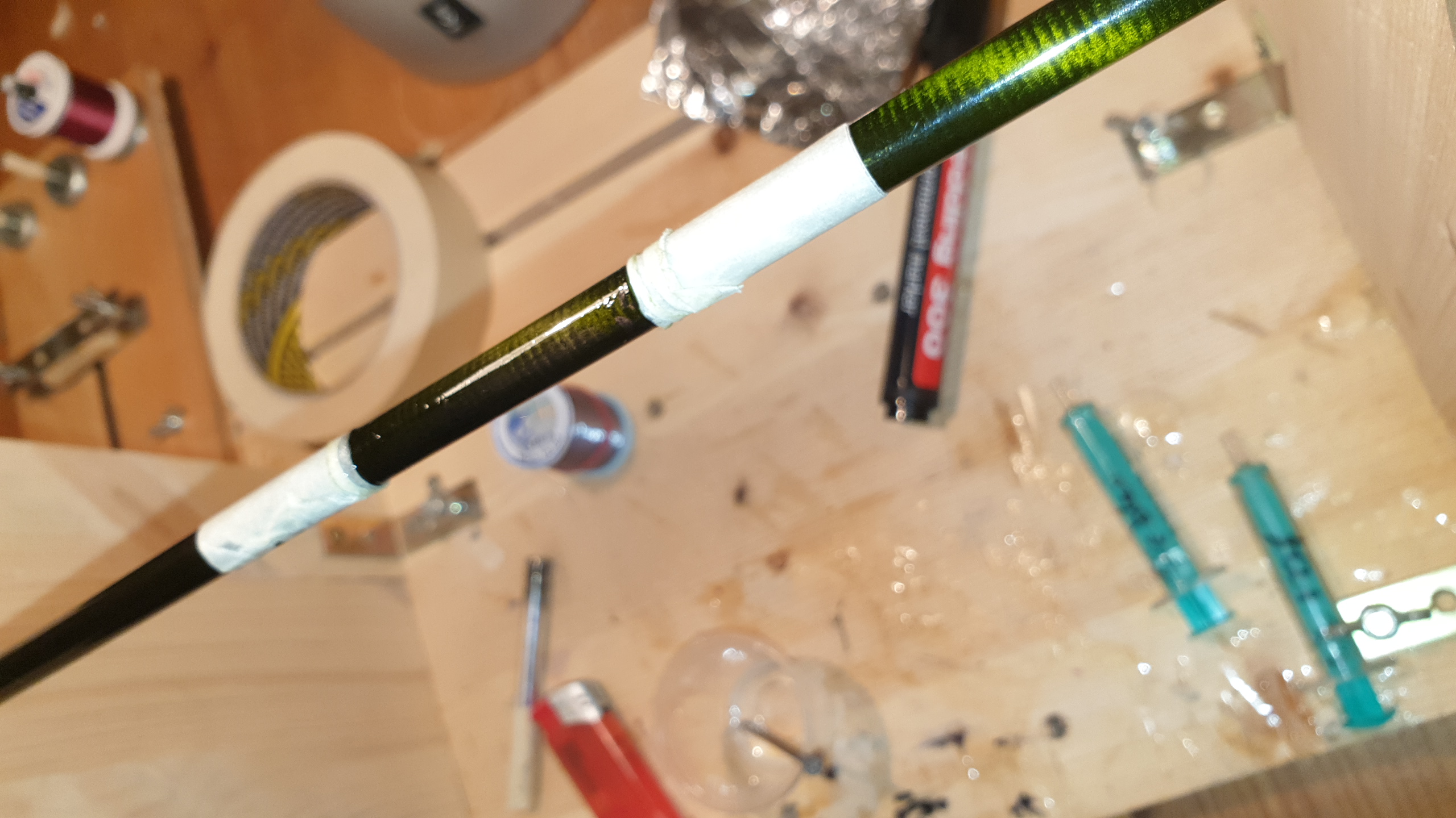 Übrigens: Am Spitzenteil und dem folgenden Teil hatte ich die Probleme nicht mehr. Hier habe ich den Bindungslack noch etwas heißer gemacht, da hat er sich schön vom Klarlack des Blanks gelöst, ohne diesen mit abzureißen.