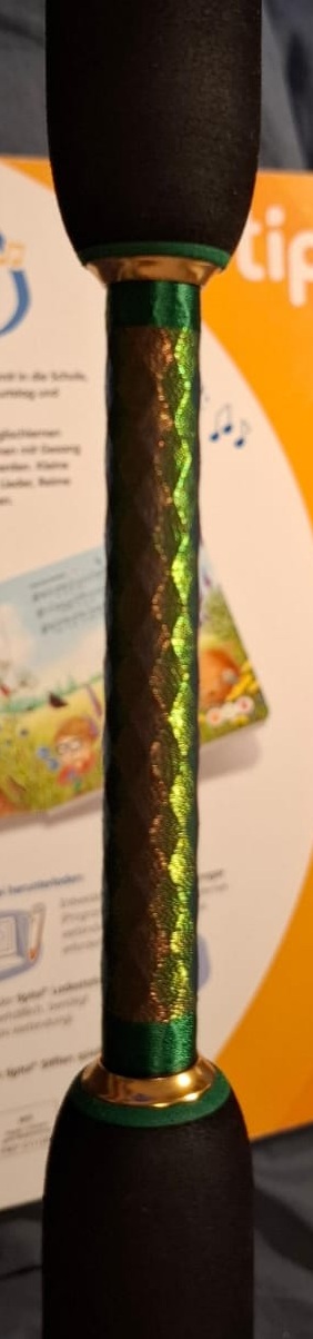 Split Grip - Fuji Prisma Galaxy als Dragon Scale, Die Unterwicklung ist Stärke D, irgendein dunkles Oliv. Das hellere grüne Garn ist wie bei den Ringen T24 Hunter Green. Das wird wohl noch stark nachdunkeln, davon habe ich kein Test gemacht. Aber das wird schon passen.