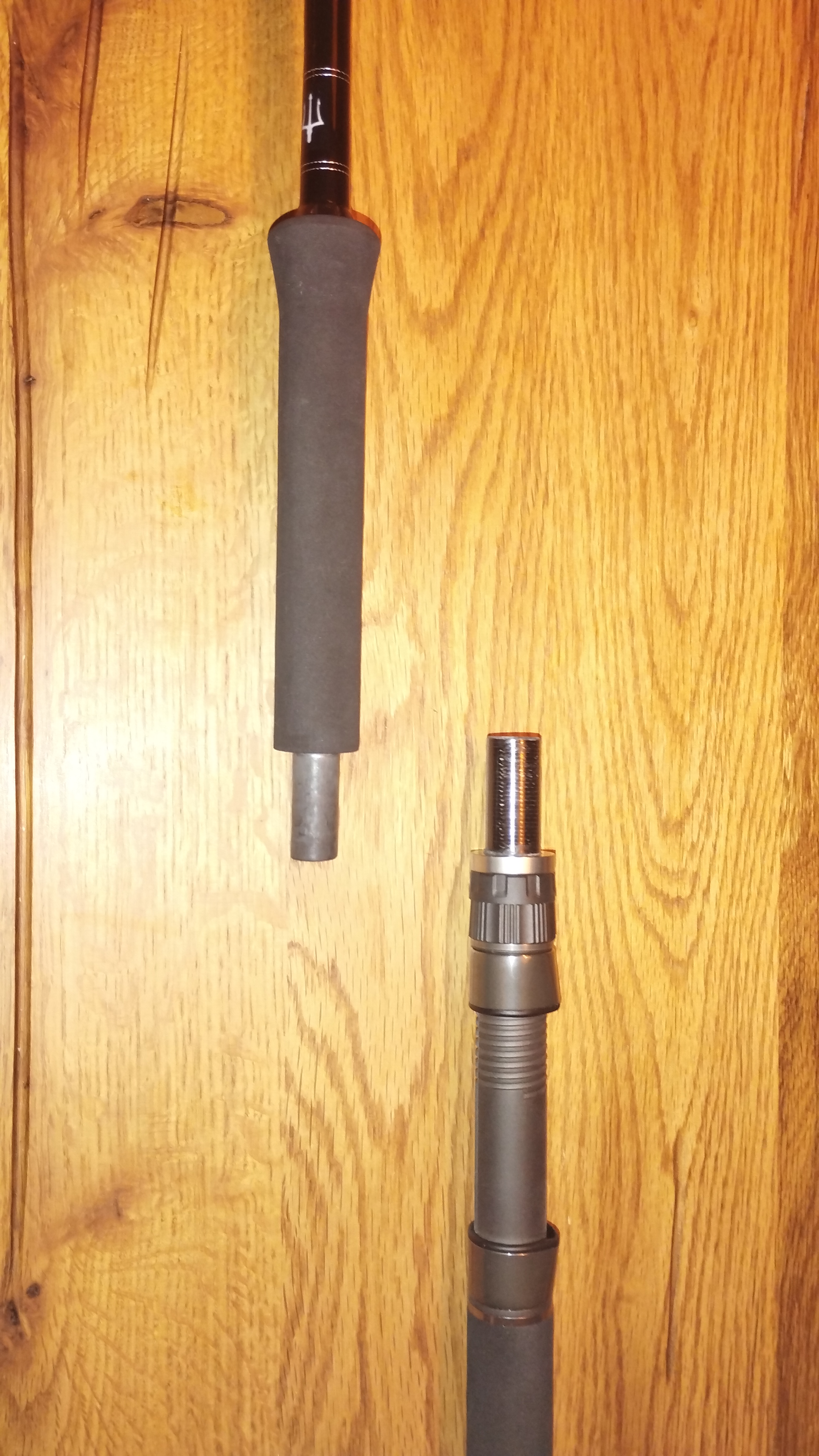Als ich den Blank zum ersten Mal in der Hand hatte, war ich mir auch nicht ganz sicher wie ich dazu stehen soll. Letztendlich habe ich mir aber die Tips von Sven zu Herzen genommen und a) den Griff wie zuvor beschrieben montiert und b) den Starter auf den Einschub des 3. Teils. Das Resultat ist eine fertig montierte 4-Teilige Rute wo man tatsächlich 2x hinschauen muss um die 3 sichtbaren Verbindungen zu bemerken.