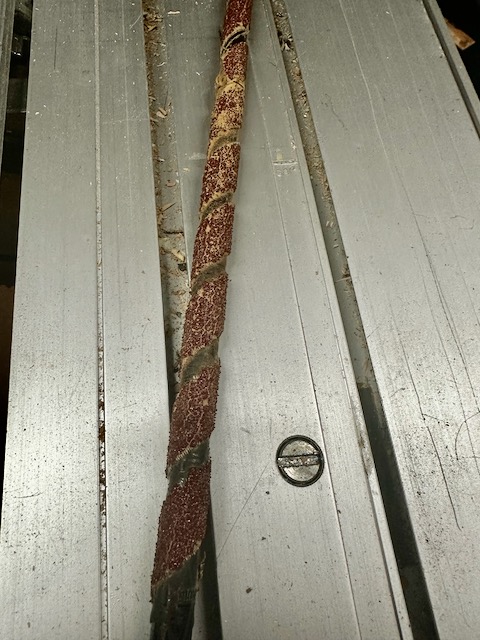 Jetzt das Blankstück mit Epoxy schön dick einstreichen. Ich nehme Endfest 300. Jetzt den Streifen diagonal auf den Blank wickeln, so, dass eine Streifen frei bleibt. Ist wichtig zur Abfuhr des Schleifstaubs.